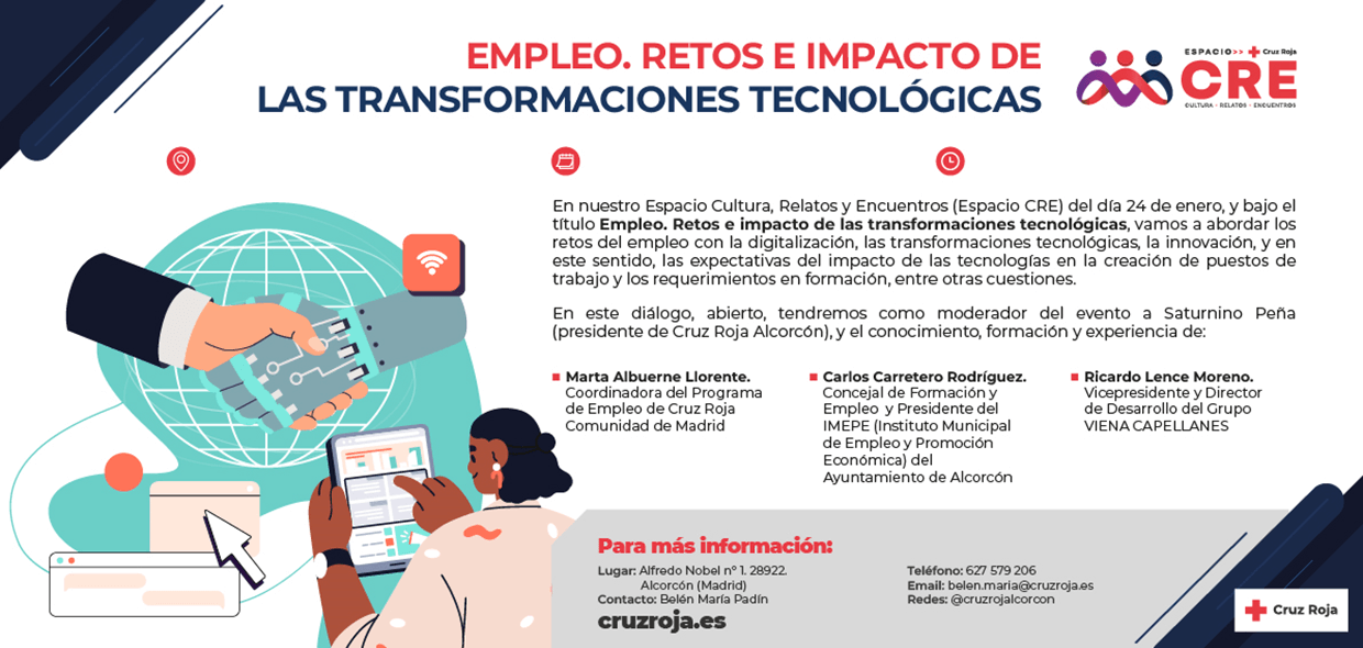En el espacio Cultura, Relatos y Encuentros (Espacio CRE) de la Cruz Roja de Alcorcón, el próximo 24 de enero y bajo el título «Empleo, Retos e impacto de las transformaciones tecnológicas», se va a realizar una exposición donde se van a abordar los retos del empleo con la digitalización, las transformaciones tecnológicas, la innovación, y en este sentido, las expectativas del impacto de las tecnologías en la creación de puestos de trabajo y los requerimientos en formación, entre otras cuestiones.