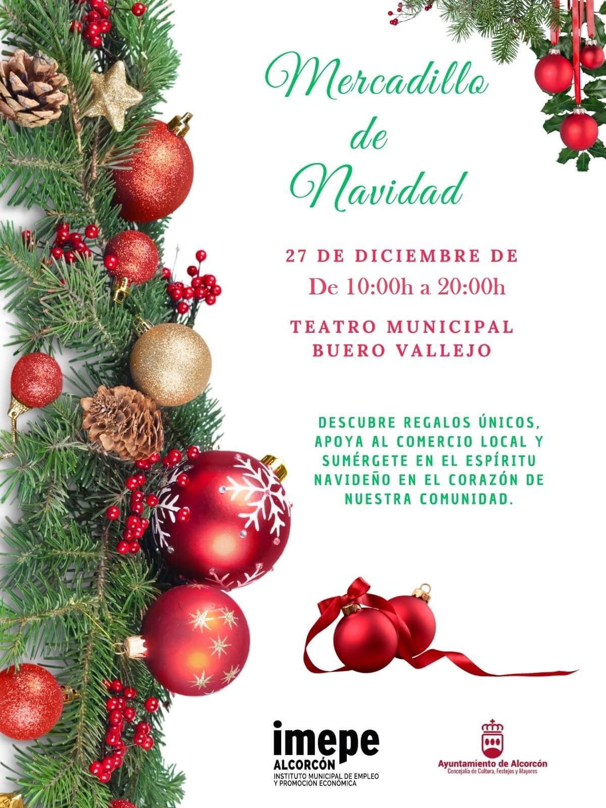 La concejalía de Cultura, Festejos y Mayores del Ayuntamiento de Alcorcón en colaboración con IMEPE ALCORCÓN y asociaciones de comercio, organizan un MERCADILLO DE NAVIDAD dirigido a la participación de establecimientos de comercio de nuestra ciudad y que se situará el próximo 27 de diciembre en el Teatro Municipal Buero Vallejo en horario al público de 10:00 a 20:00h.